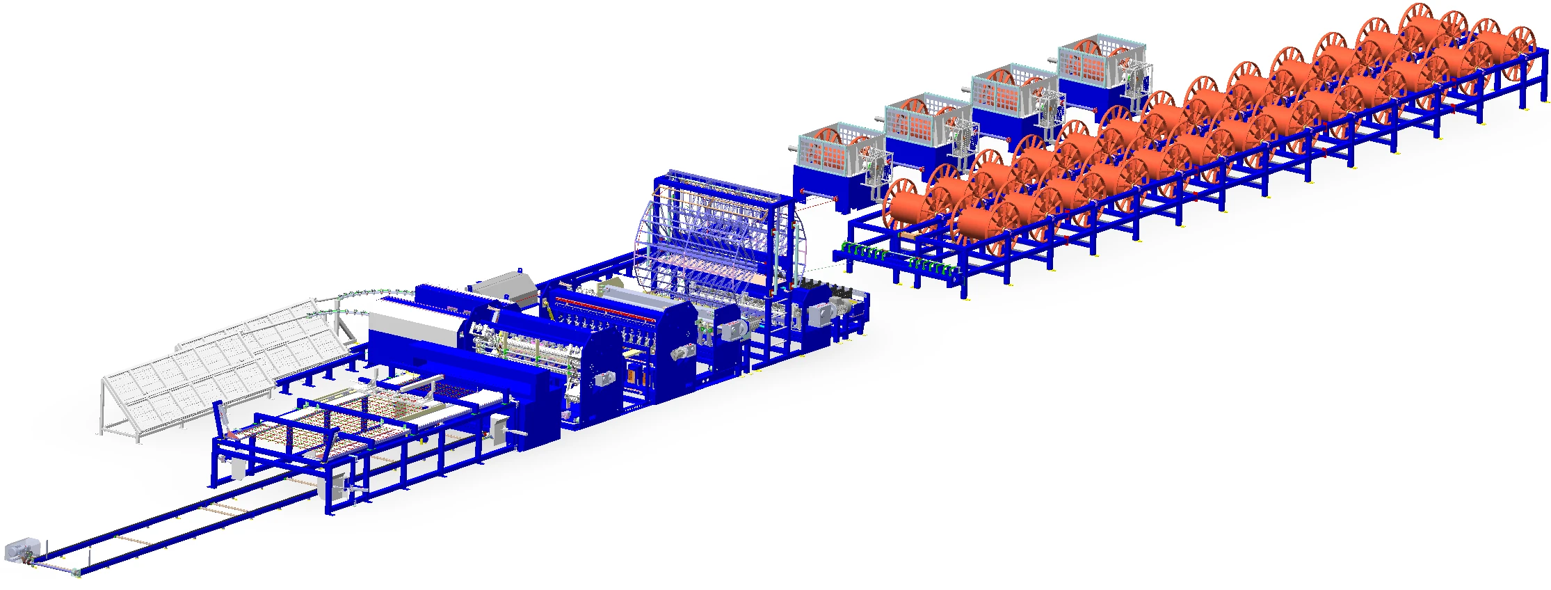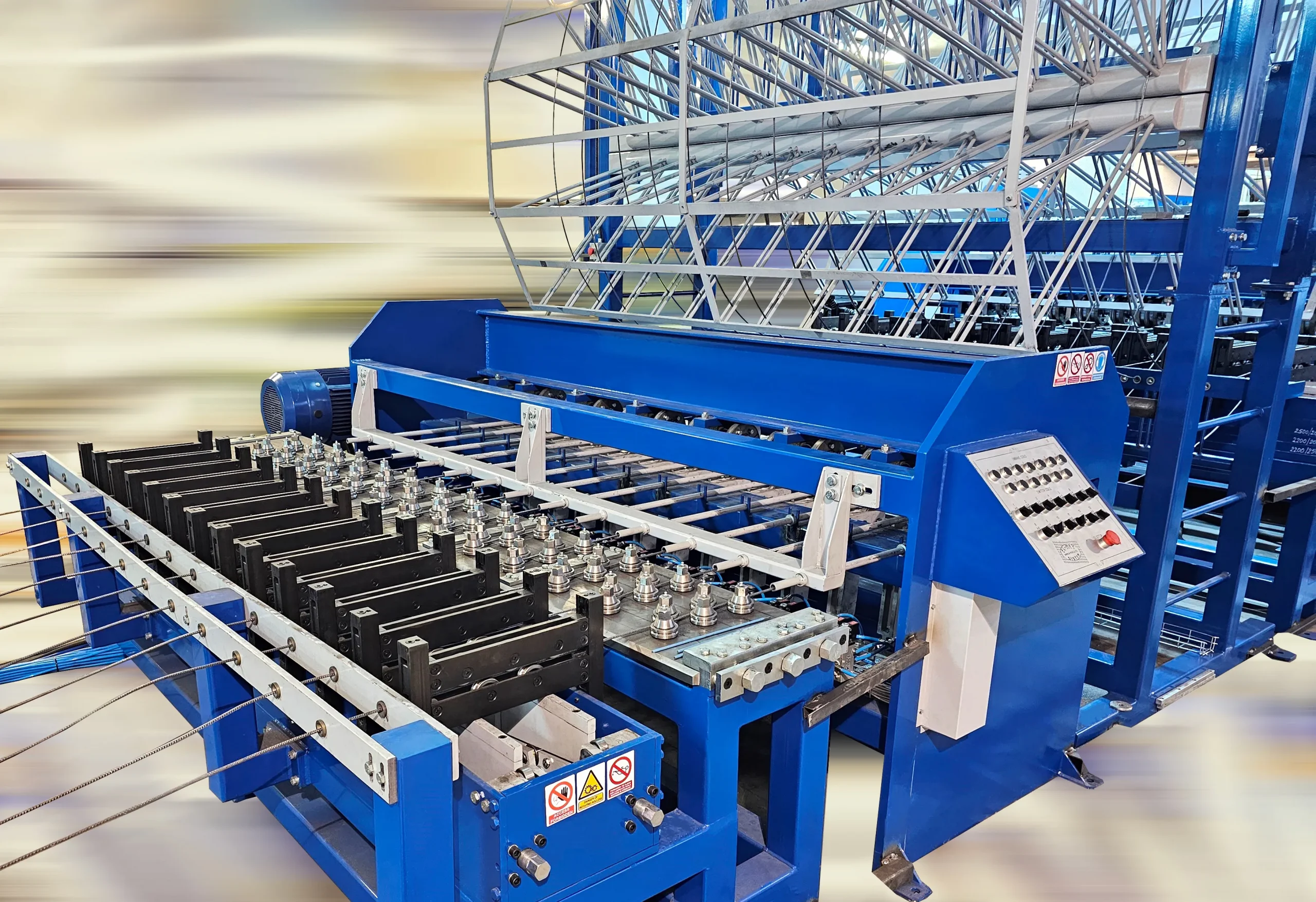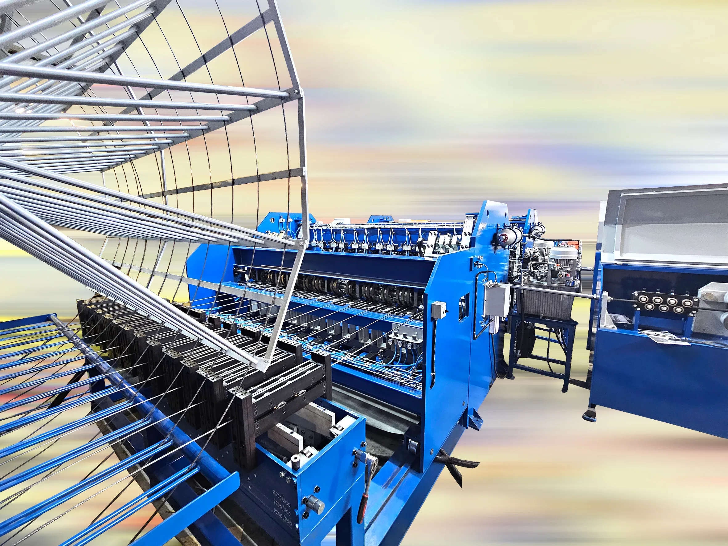 Machine à double soudage, soudant les fils transversaux au-dessus et au-dessous des fils longitudinaux. Capable d’atteindre une vitesse allant jusqu’à 210 fils transversaux/minute.