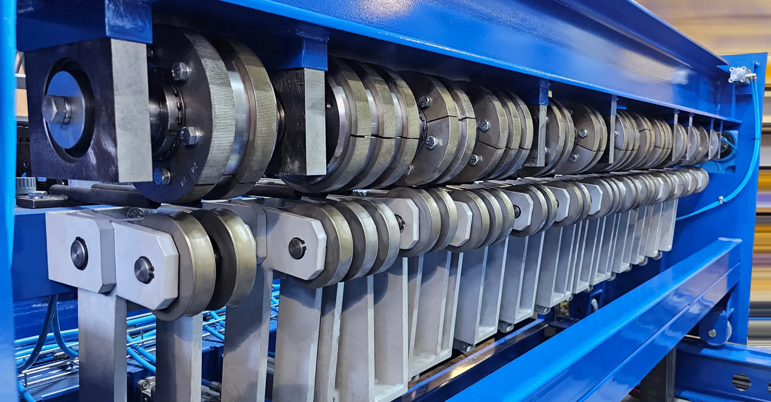 La machine est conçue pour une production industrielle haute performance, avec un puissant système de soudage de 14 x 63 kVA et des moteurs d’entraînement de 155 kW. Fonctionnant sous une alimentation de 3 x 400 VAC et contrôlée par un système informatique, elle assure une coordination précise, un fonctionnement stable et une qualité de soudure constante.